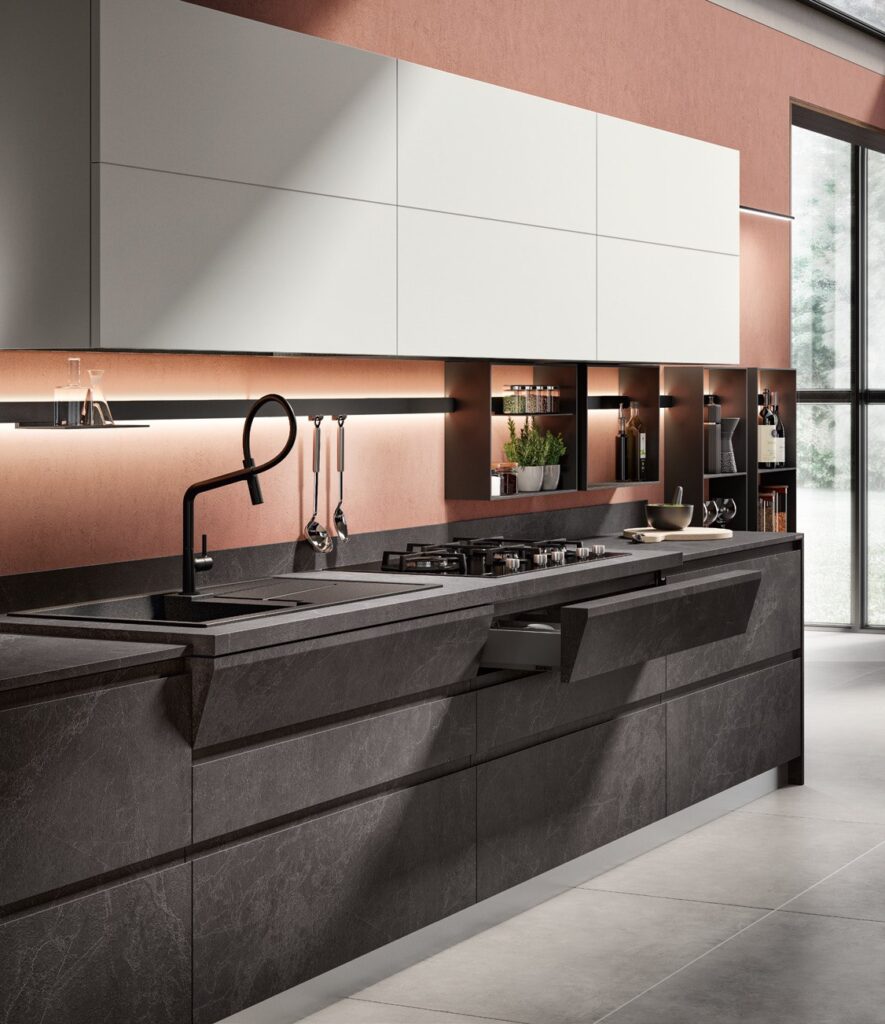 Viene realizzato con una struttura molto compatta e omogenea, garantisce un’ottima impermeabilità, resiste agli urti, ai graffi e alle elevate temperature. Con i piani in gres si può avere il lavello integrato.